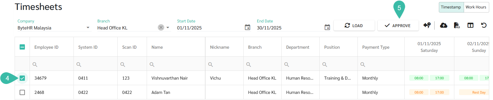 - Select the name of the employee whose timesheet data you want to approve for payroll processing.
