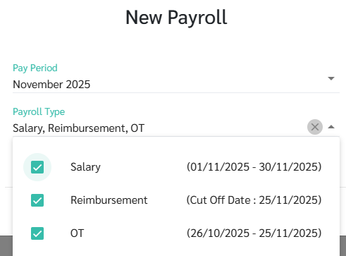 - Select the pay period. The system will automatically display the payroll cycle if applicable.