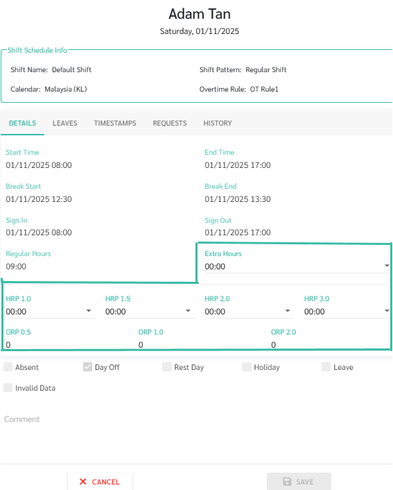 - If the Timesheet has already been approved, the information cannot be edited. If you want to edit an approved Timesheet, the admin must delete the Payroll block, then you can edit it.