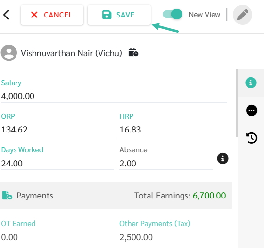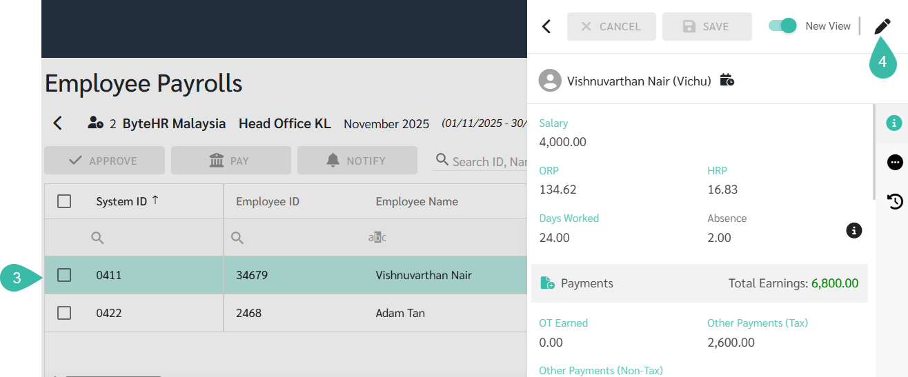 - Click on the name of the employee whose salary information you want to edit. The system will display the salary details on the right-hand side.