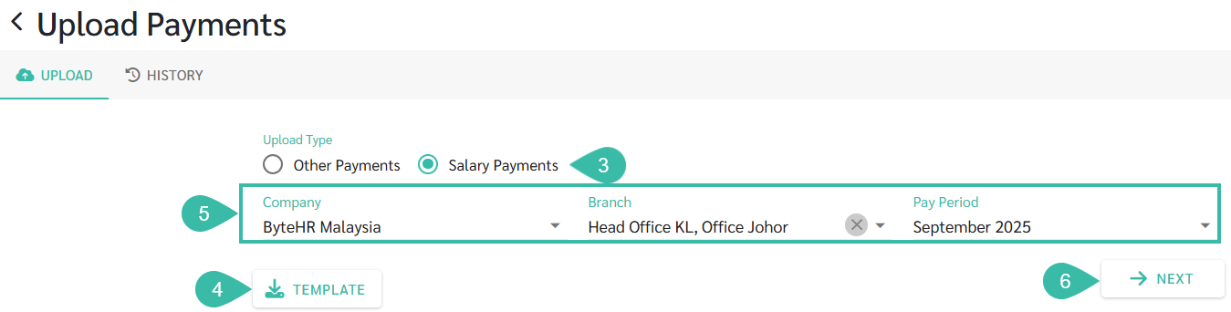 - Once the Salary Payments template is completed, select the Company, Branch, and Pay Period.