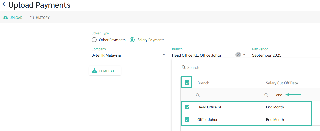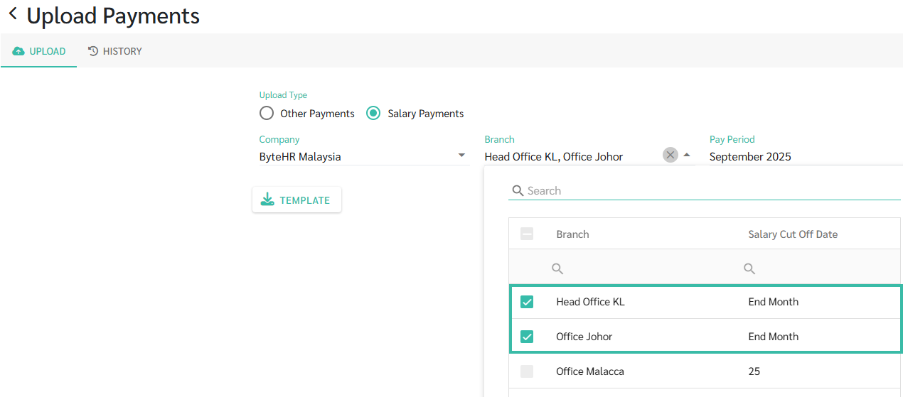 You may select multiple branches simultaneously, provided that each branch has the same salary cut-off date.