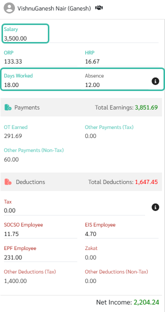 The salary details will show a salary of RM 4,000, 18 working days, and 12 days absent.