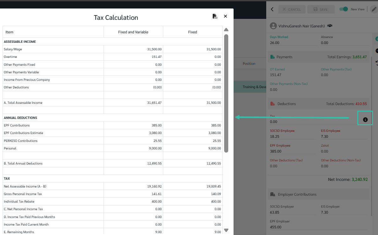 This will open a pop-up window displaying a detailed breakdown of the employee's tax computation.