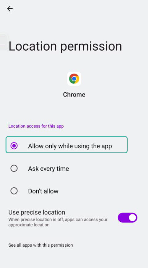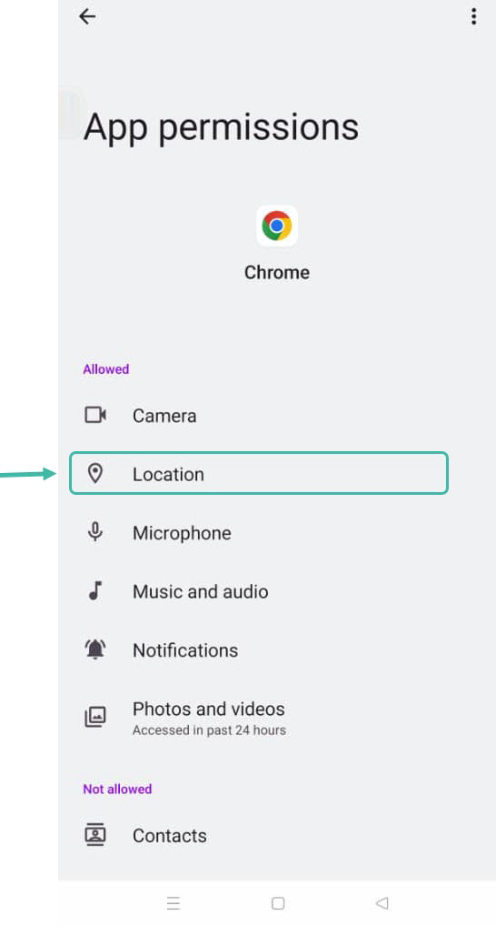 Go to Settings -> Select Apps -> Search for Chrome -> Select Permissions -> Turn on Location Access Permissions