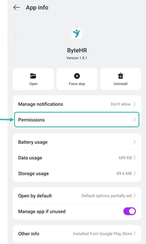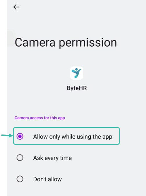 Open Mobile Settings -> App Management -> Type ByteHR -> Select Permissions -> Allow only while using the app.