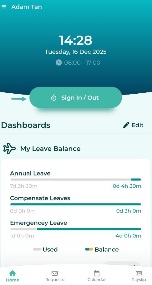 On the Home page of ByteHR mobile app, click the Sign In/Out button to record your working hours.