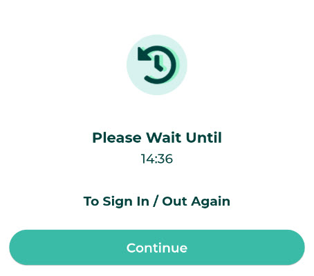 If you clock in again at 14:33, the system will display a message saying "Please wait until 14:36 before you can Sign in/out again."