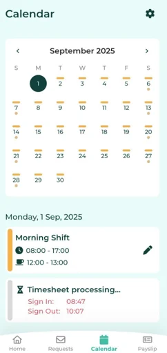 Employees can view their timestamps information in the Calendar page. If they see the message "Timesheet processing," it means the system is processing employee timestamp data into the Timesheet page. This notification may appear if you sign in/out during peak hours, approximately between 8:00 AM and 9:00 AM and between 5:00 PM and 6:00 PM.