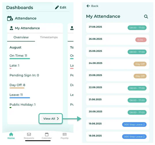 - My Attendance: Consists of Overview and Timestamps.