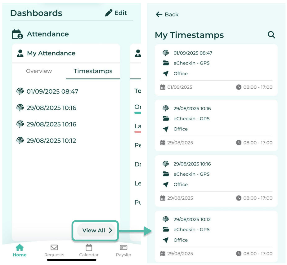 - The Timestamps tab allows employees to view their daily sign in/out entries.