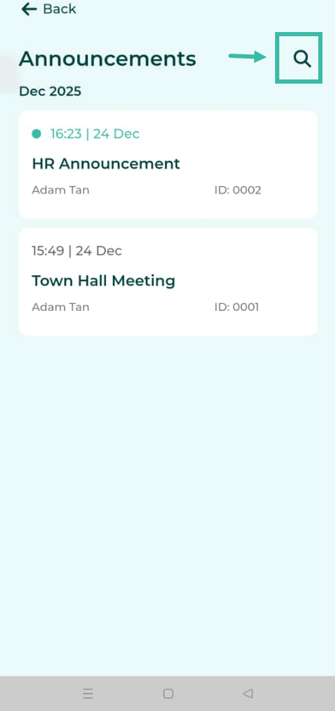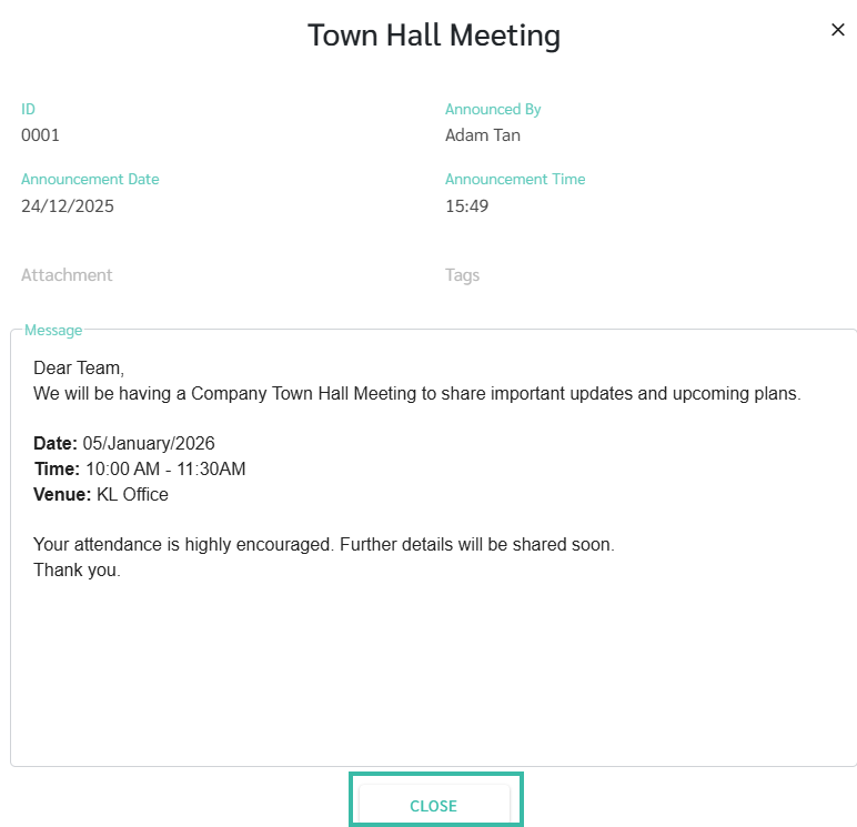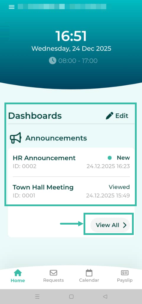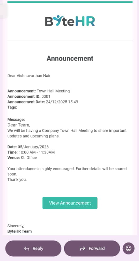 Employees can click on "View Announcement" after logging in to view the details of the announcement.