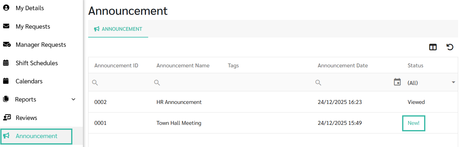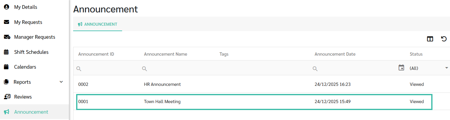 After you have viewed the details in the announcement, the announcement's status will change to "Viewed".