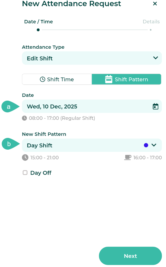 - The system will display the start and end time of the shift schedule along with the name of the Shift Pattern when you select the date to Edit Shift.