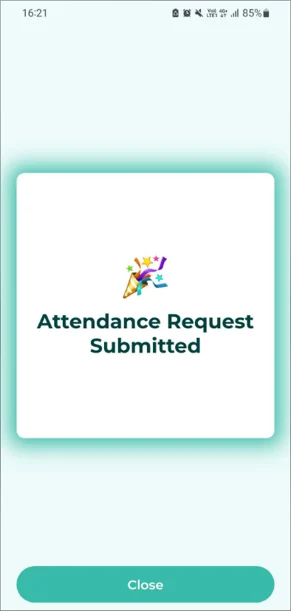Once a request has been successfully submitted, a confirmation message will be shown " Attendance Request Submitted" and the submitted Request will appear on the Requests page under Attendance option displaying the type of Attendance Request submitted, with the status "Submitted".