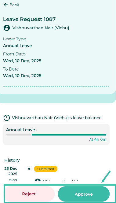 Once a request is approved or rejected, a confirmation message will be displayed "Request Approved" and the employee will receive an email and mobile notification.