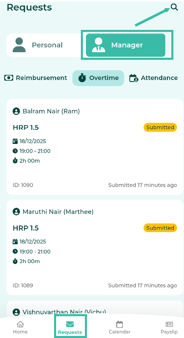 Requests tab -> Select Manager option -> Select the Requests type -> Click on the Requests to review the details -> Scroll down to view the History of the Submission, Approval, Rejection of the Requests.