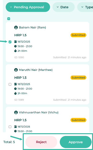 Tick the checkbox next to the request, then tap the Approve or Reject button below.