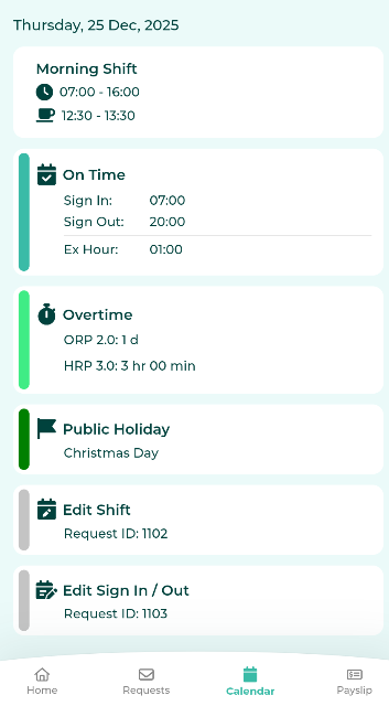 - Grey colour + calendar icon with pencil indicates Edit Shift and Edit Sign In/Out request has been Approved.