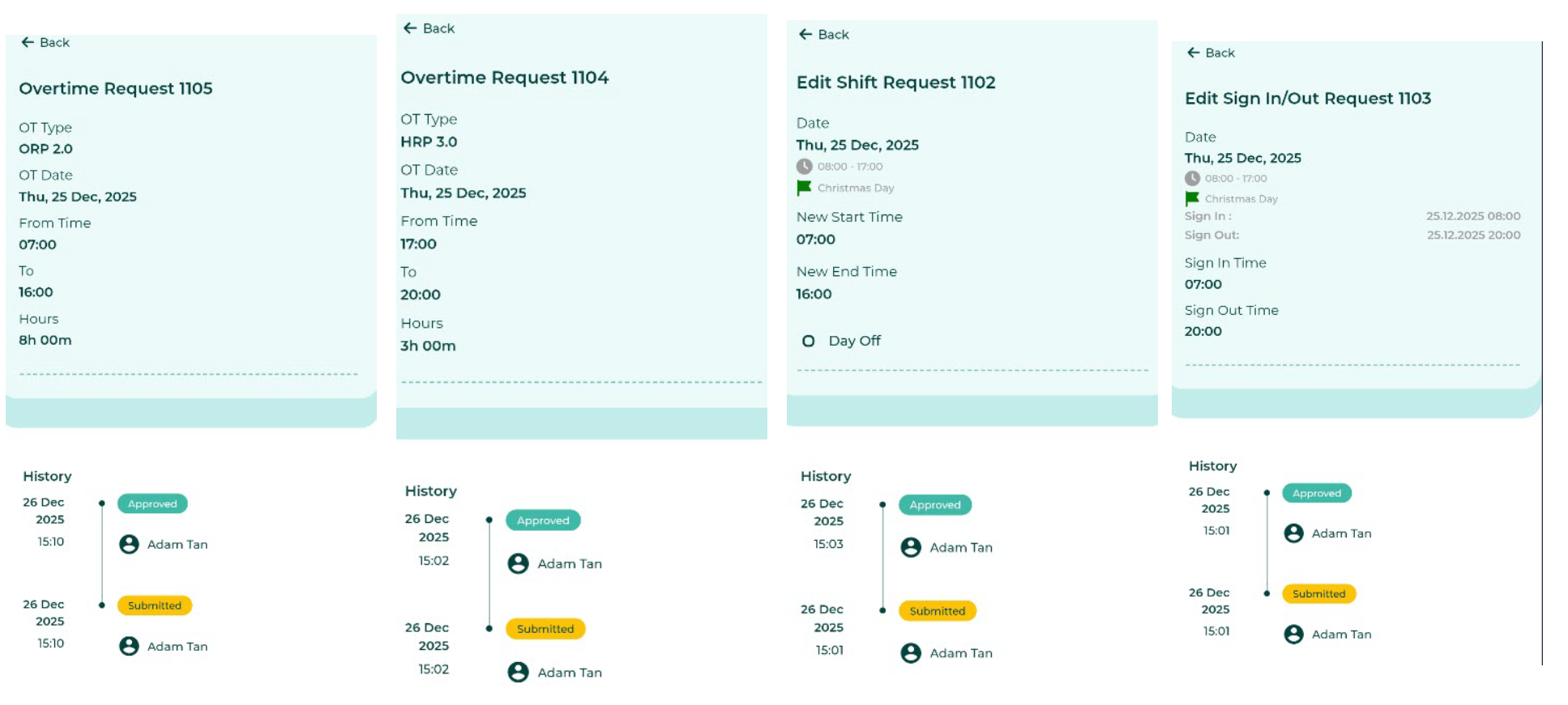 - Lime green colour + stopwatch icon indicates Overtime request has been Approved.