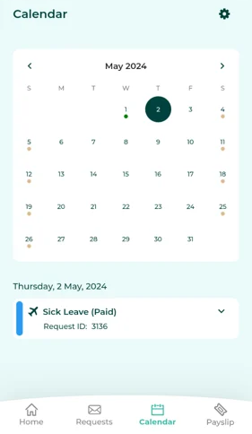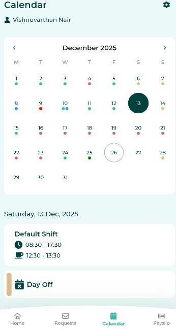 Leave days: Displayed based on approved employee Leave requests.