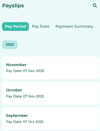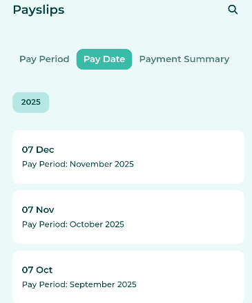 Log in to the Mobile App -> Click Payslip ->Select the Pay Date or Pay Period tab -> Click the Payslip Block to view the Payslip Details.