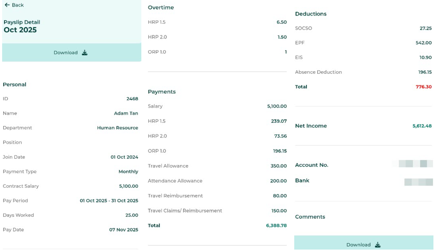 - Once selected, the system will display the employee's Payslip details in the Mobile App.