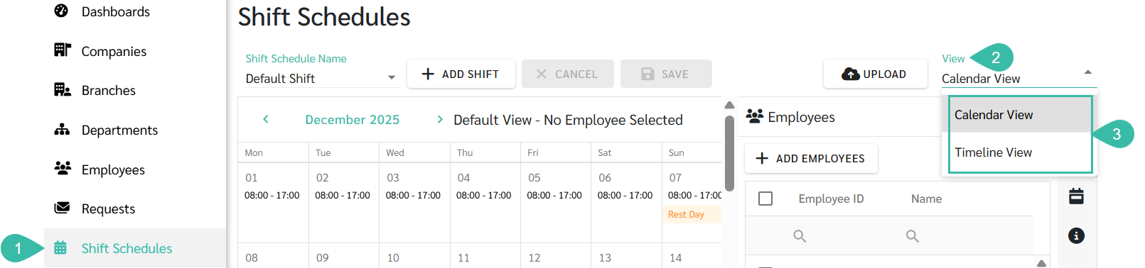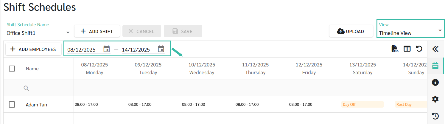 Go to the Shift Schedule tab -> Click the View Dropdown list -> Select Calendar View or Timeline View