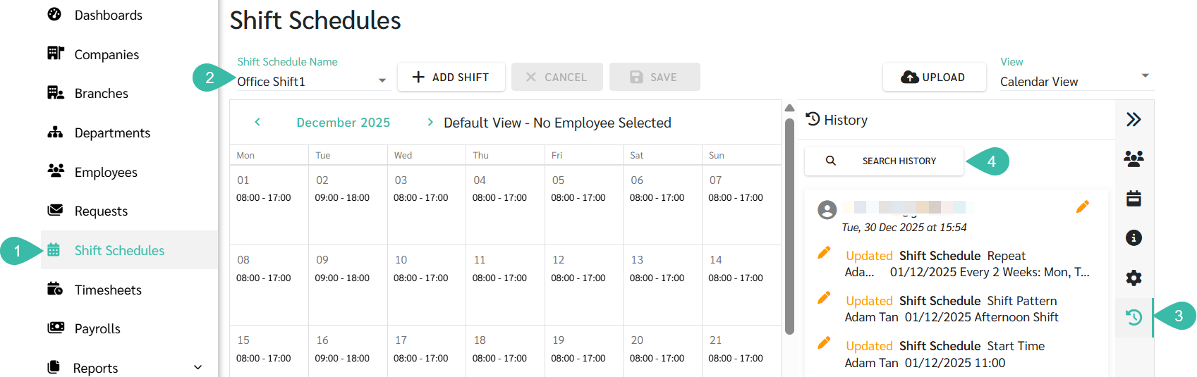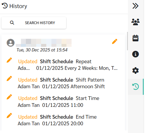In the event of any changes or updates to a Shift Schedule, admin can review the edited/updated history by following the steps below:
