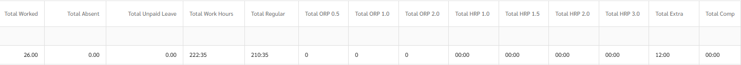 | Total HRP OT 1.5 | The total number of hours worked at OT 1.5 rate. |