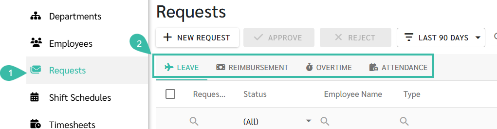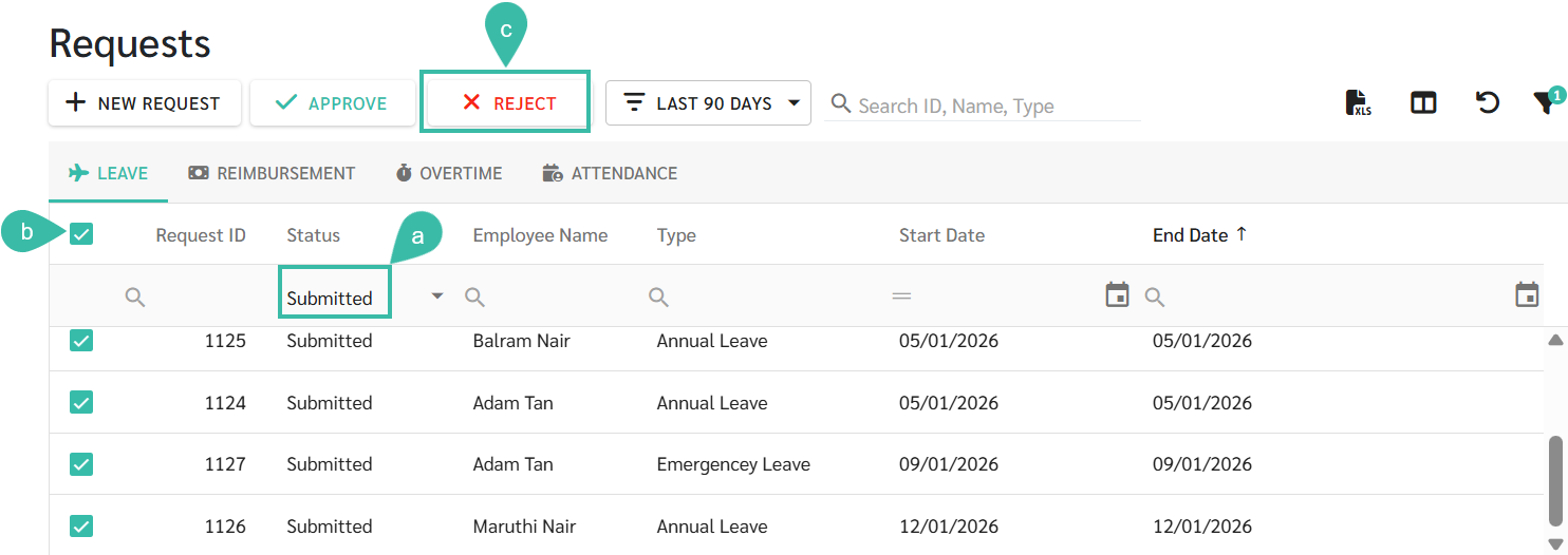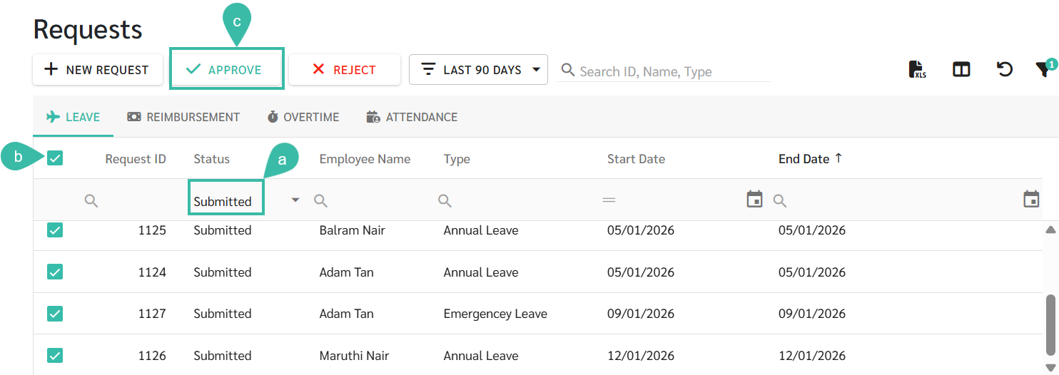 Requests -> Select the Request Type -> Tick the checkbox of the Request you want to Approve/Reject -> Click Approve/Reject