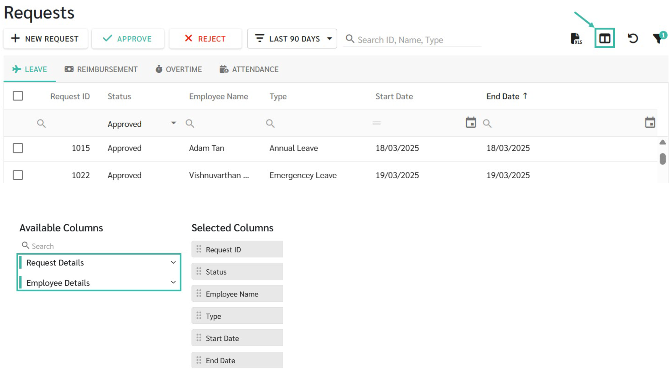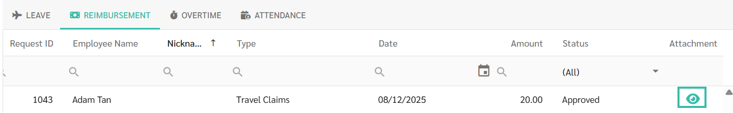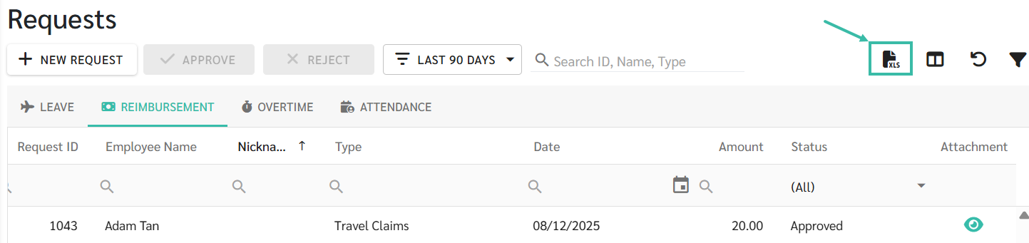 - Type: The type of Request submitted (Leave Type, Reimbursement Type, OT Rate, and Attendance Type)