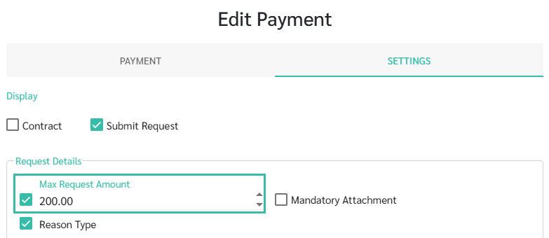 - If a Max Request Amount is configured in the Payments type Settings, per Reimbursement Requests exceeding the amount cannot be submitted.