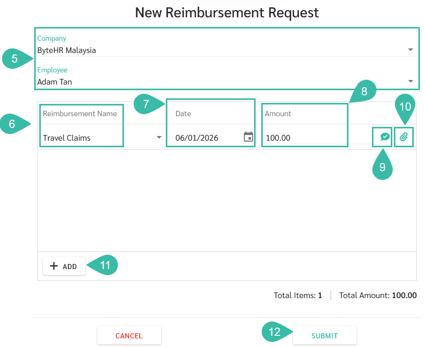 - Click "Add" to add multiple reimbursement type and repeat the steps above.