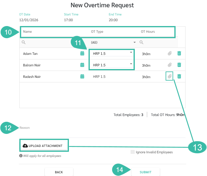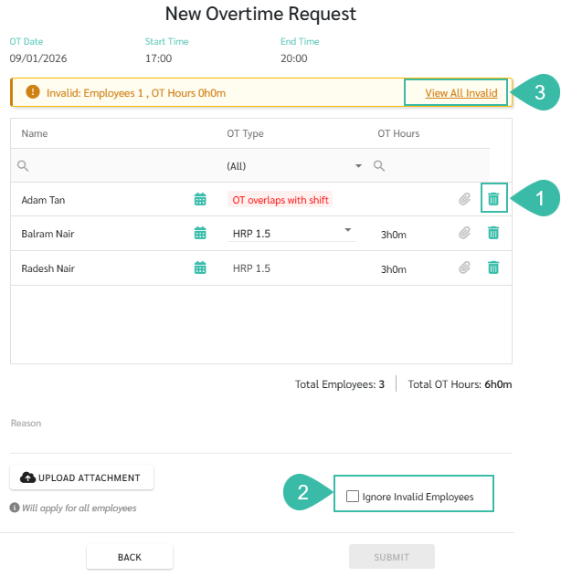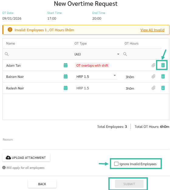 - Tick the Ignore Invalid Employee to exclude that employee from the Request.