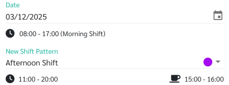 Select a New Shift Pattern. The system will display the Start and End Time as well as the Break Time for the selected Shift Pattern.