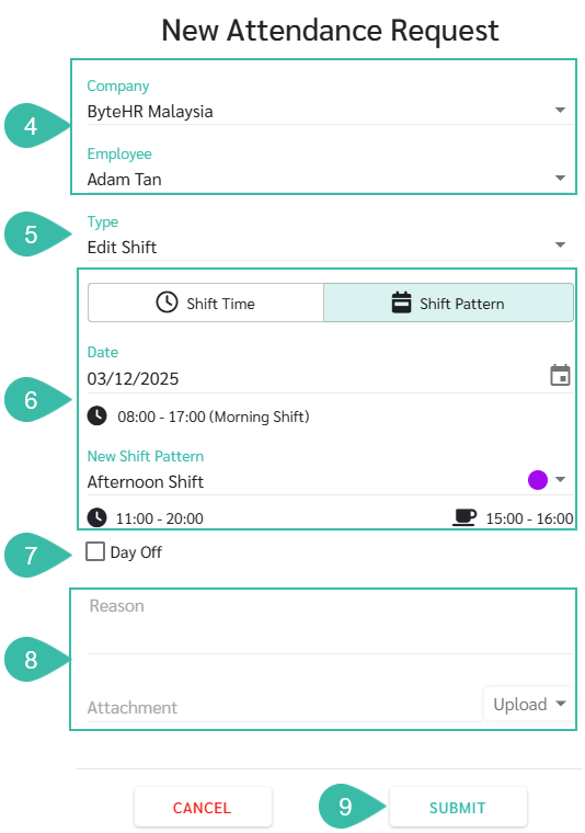- Edit Shift Pattern/Time must result in different Start and End Time or Break Time from the Original Shift.