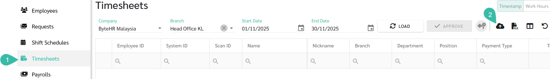 Once the Fingerprint Scanner is successfully connected to the ByteHR software, you can upload the timestamps from the fingerprint scanner following the steps below: