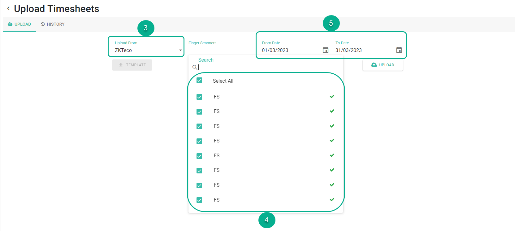 - Select the active Finger Scanners you want to upload data from. The system will only display the currently active fingerprint scanners. Multiple scanners can be selected simultaneously.