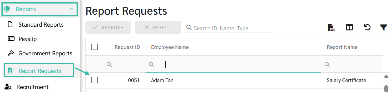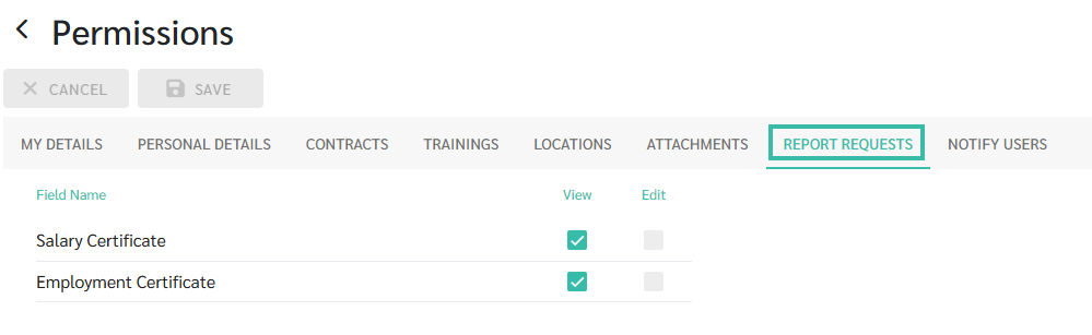 - Open the Report Requests tab to configure which type of Report, employees are allowed to View.