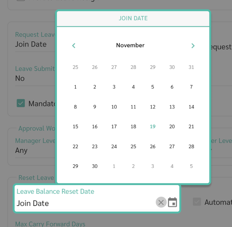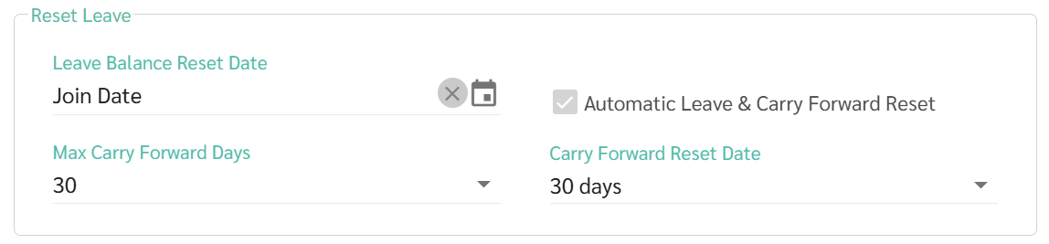 - You can specify a fixed date or Join Date. If Join Date is selected, leave will be reset individually on each employee’s join date every year.