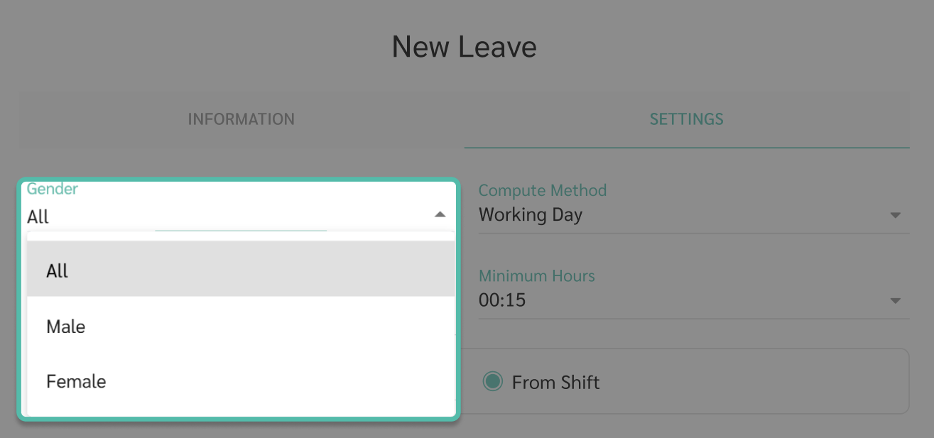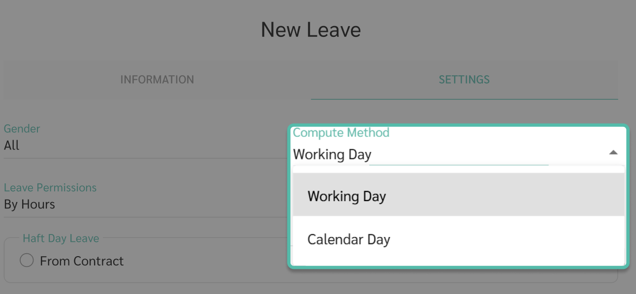 This leave type allows half-day or full-day leave only. If By Hour or Half Day is enabled, the system will ask whether half-day hours are calculated based on the employment contract or shift schedule.