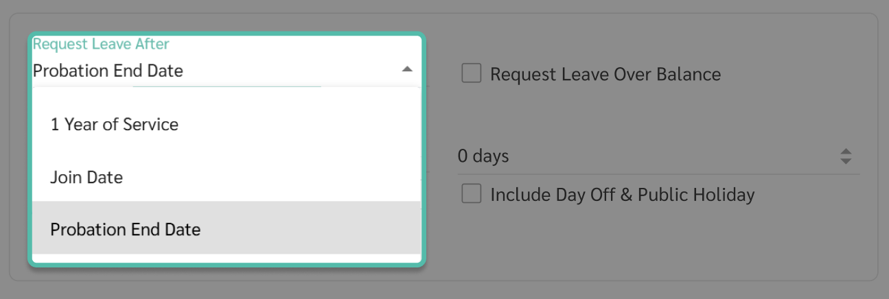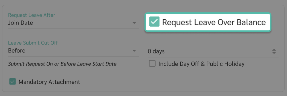 Enable this option to allow employees to request leave exceeding the remaining balance. If leave exceeds the balance, the remaining leave balance will be displayed as a negative value.
