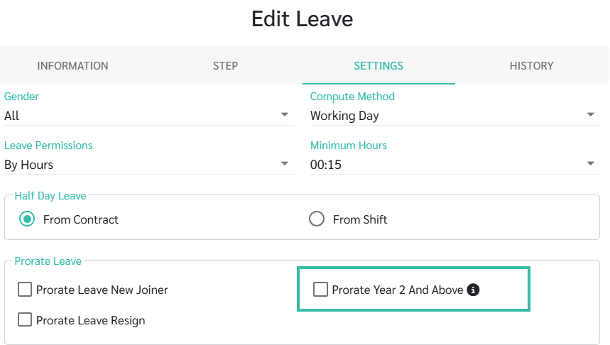 - Under the Settings tab, enable "Prorate Year 2 and Above" if you want the system to prorate Leave entitlement based on years of service from the second year onwards.