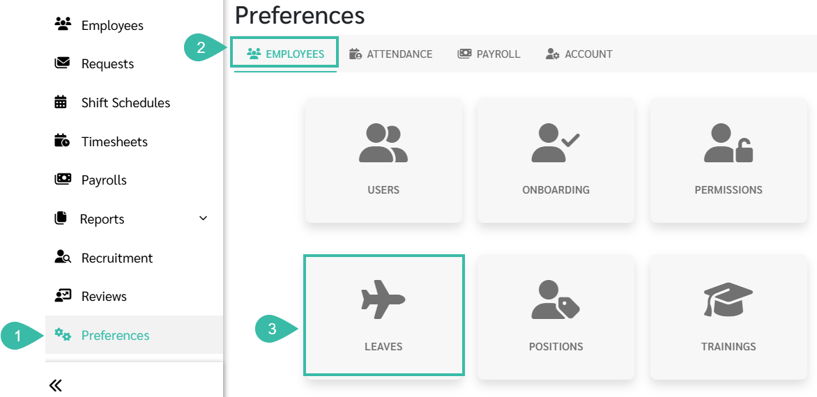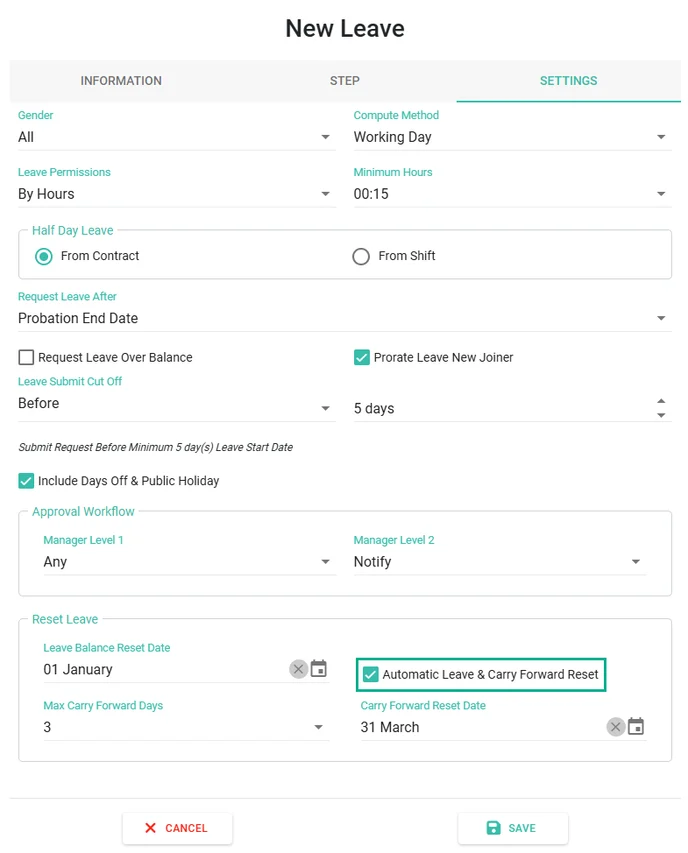 To enable automatic leave reset, configure the setting for each Leave Type as follows: