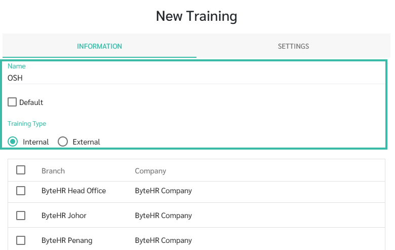 In the Name field, add the Name the training/seminar and select the Training type.