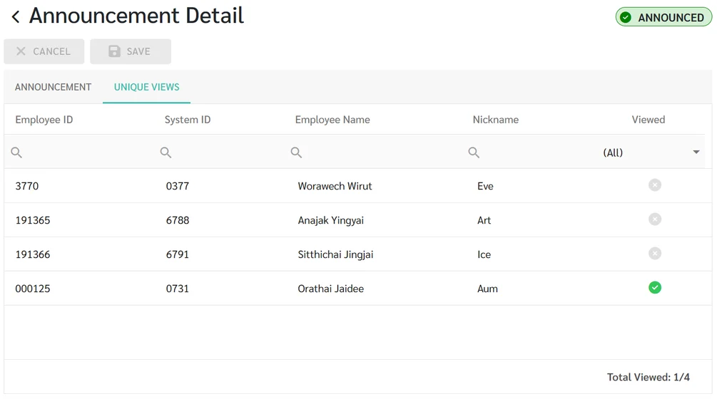 Once the announcement is made, the admin can click on the "Recipients" tab to check the list of employees and verify whether they have read the announcement.