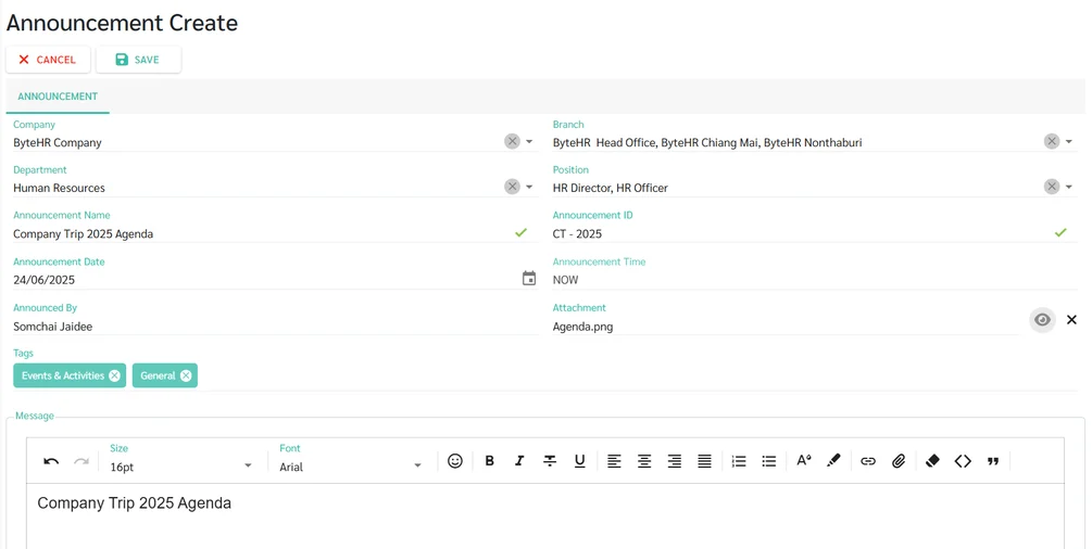 - New employees can view previously posted announcement under the branch, department, and position they are assigned to.