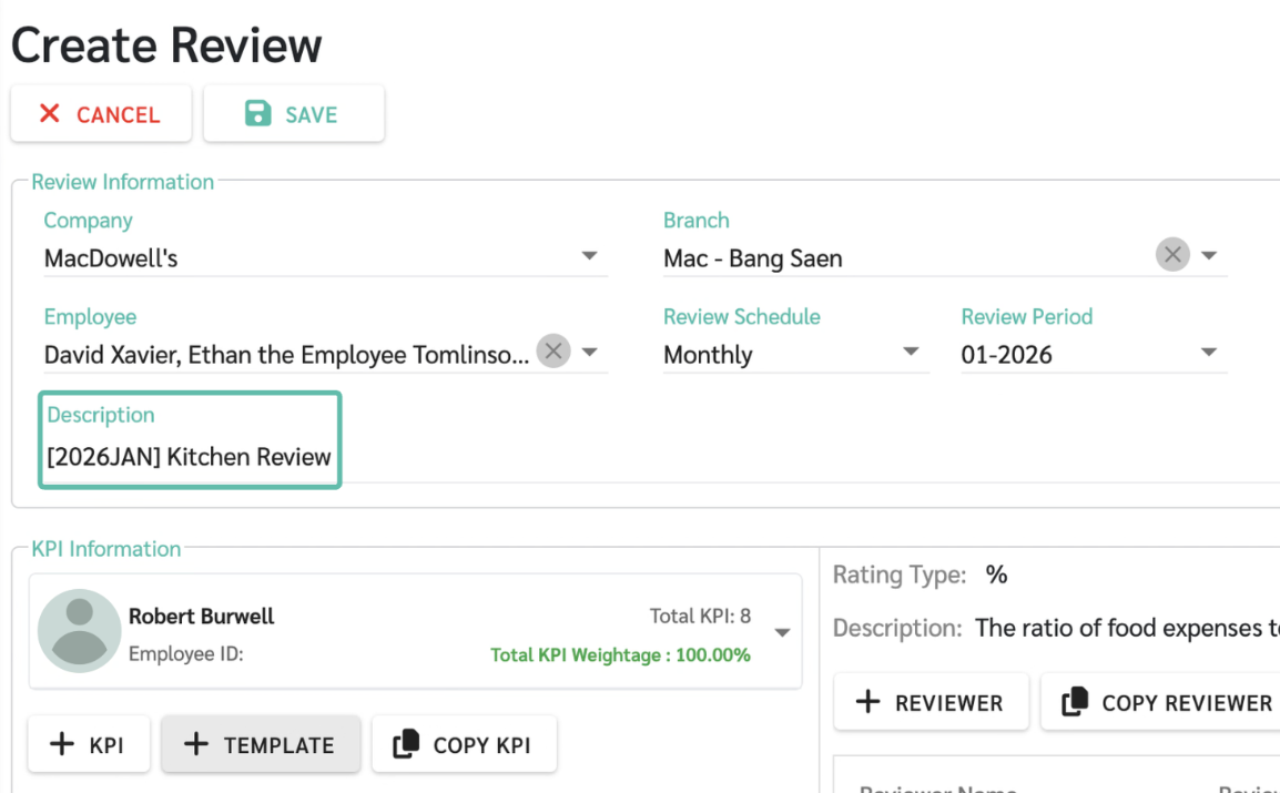 - The system will automatically apply the KPI set and weightage from the selected template.
