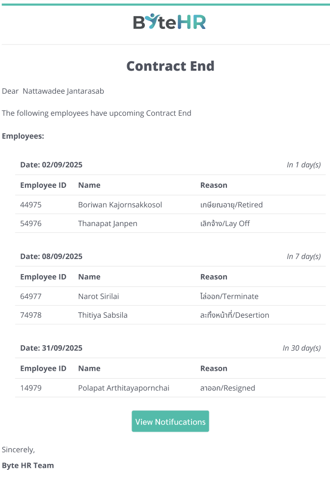 The system will then notify the selected admin via the web app and email when an employee's contract expires within the set period.